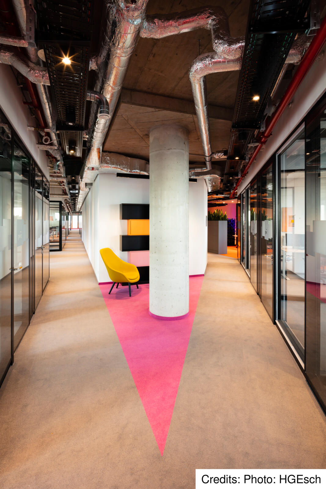 Aufgrund der Lage des Eclipse, umgeben von zwei sich kreuzenden Bundesstraßen mit hoher Lärmentwicklung im Außenbereich, befinden sich die Aufenthaltsflächen für die Nutzer von Eclipse im Wesentlichen im Inneren des Bürogebäudes. Herzstück sind die Atrien und Lichthöfe, die sich auf mehreren Etagen befinden und teils über drei Geschosse ragen. In diesen Atrien finden die Mitarbeiter verschiedenste Aufenthaltsbereiche, wie eine Cafeteria oder einen Veranstaltungssaal, die auch von außen betrachtet deutlich in der Fassade ablesbar sind. Dort, wo die planen Fensterflächen in der Glasfassade zu sehen sind, verbinden sich die Lichthöfe und formen einen „vertikalen Campus“, der bis zur Dachterrasse mit weitläufigem Blick über die Stadt reicht. „Das Eclipse agiert als ein Kommunikator und schafft eine städtische Verbindung zwischen Nachbarschaft und Arbeitswelt“ sagt Werner Sübai, Senior Partner HPP Architekten. Beim Bau des Gebäudes spielte auch das Thema Nachhaltigkeit eine große Rolle.