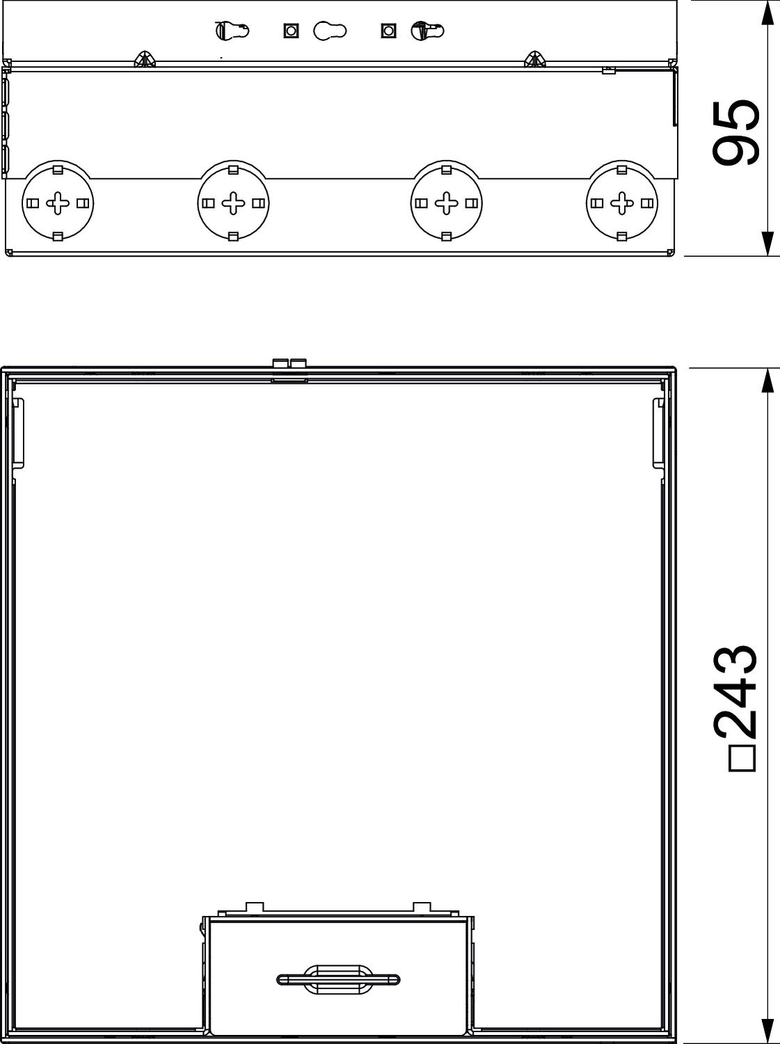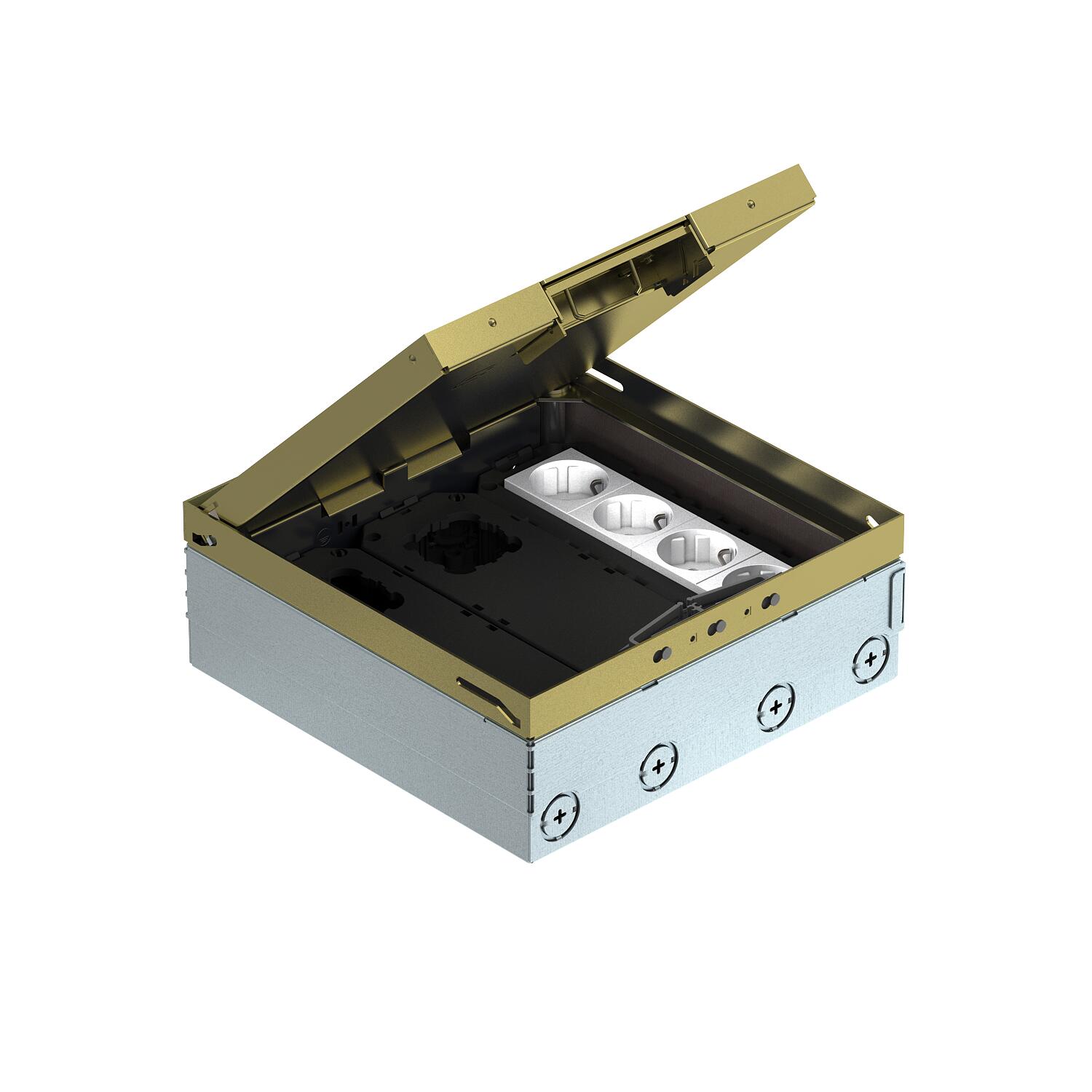 ProduktbeskrivningKvadratisk golvbox för användning i hålgolv som torrstädas och underlagsgolv inomhus. Kapslingar med införingsöppningar för rör (M25). Med 3 uttagsenheter av typen UT4 och två 2-vägsuttag. Överdel justerbar mot golvbeläggningens överkant via 4 höjdjusteringsskruvar. Minsta monteringsdjup är 95 mm, höjdjusteringsintervallet + 30 mm. I leveransen ingår en monteringshållare för FLF-enheter.