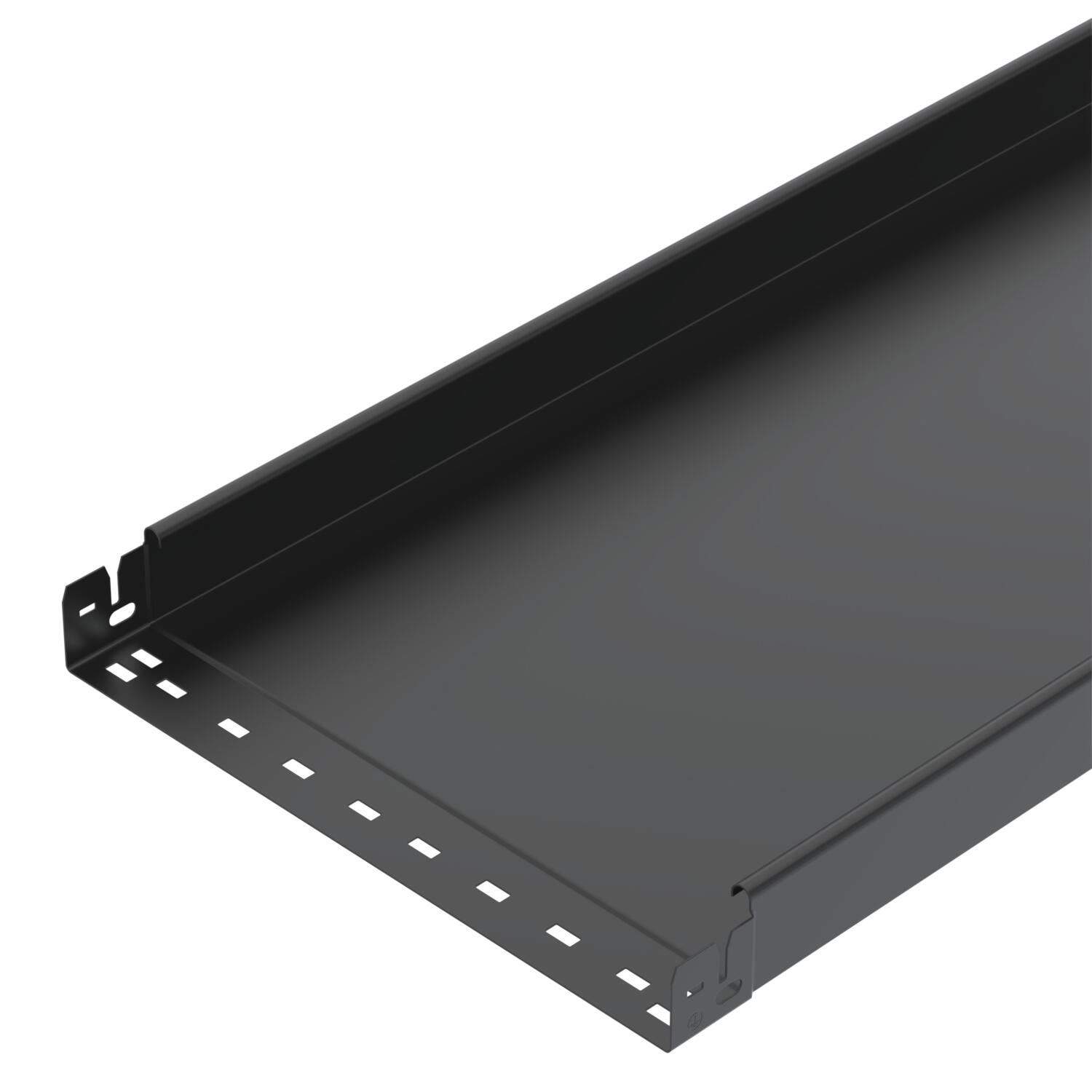 ProduktbeskrivningOperforerad kabelränna med integrerat snabbfästsystem. Svart beläggning.
