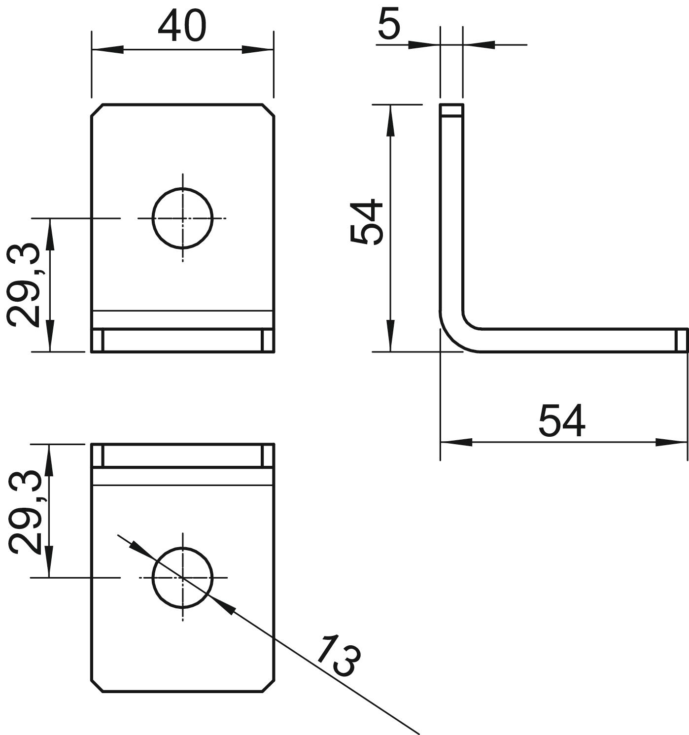 ProduktbeskrivningMonteringsvinkel med 2 hål för anslutning av profilskenor 41 x 41 mm och 41 x 21 mm i 90° vinkel.