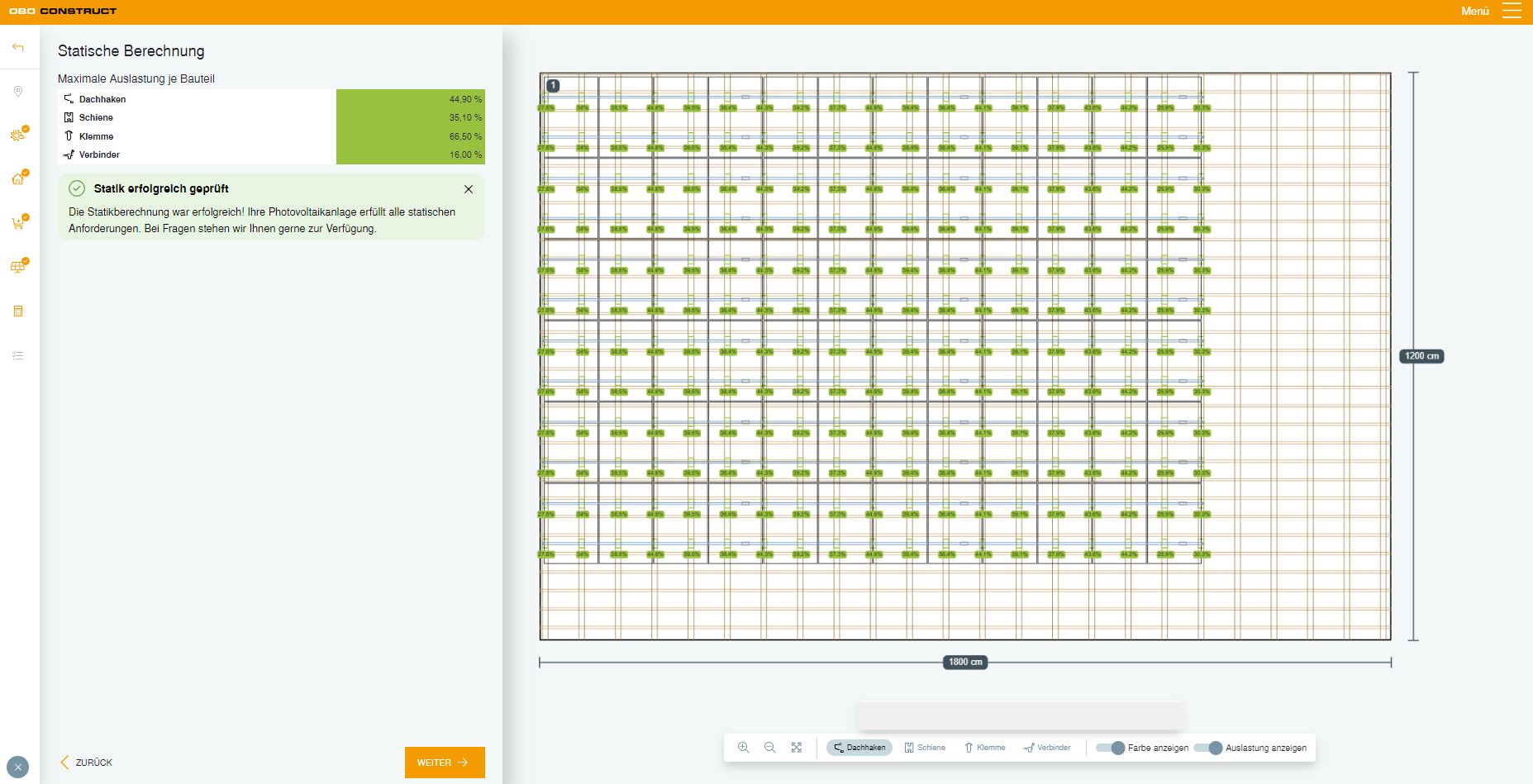 Skapa ditt solpanelsprojekt online, bearbeta det och spara sedan planeringen. Vårt verktyg beräknar automatiskt antalet komponenter som behövs och skapar sedan en planeringsbaserad grafik för underkonstruktion och modulplanering. Du kan enkelt ladda ner dessa, samt offerter och olika underlag för statisk beräkning av vår monteringskonstruktion, i olika filformat.